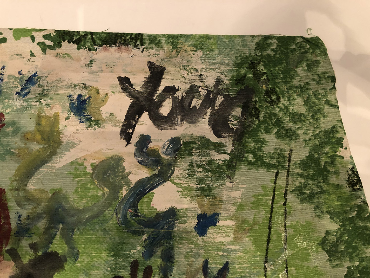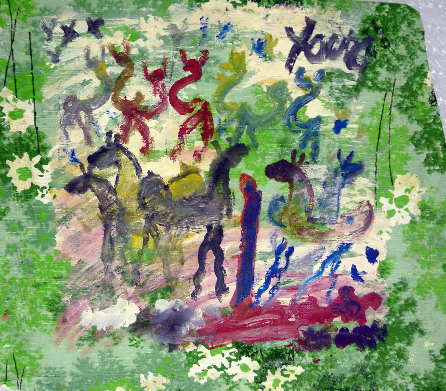 The painting is done on found fabric. This piece shows wild horses and dancing figures, perhaps representing their powerful quest for freedom. He painted several pieces on this green, floral fabric.